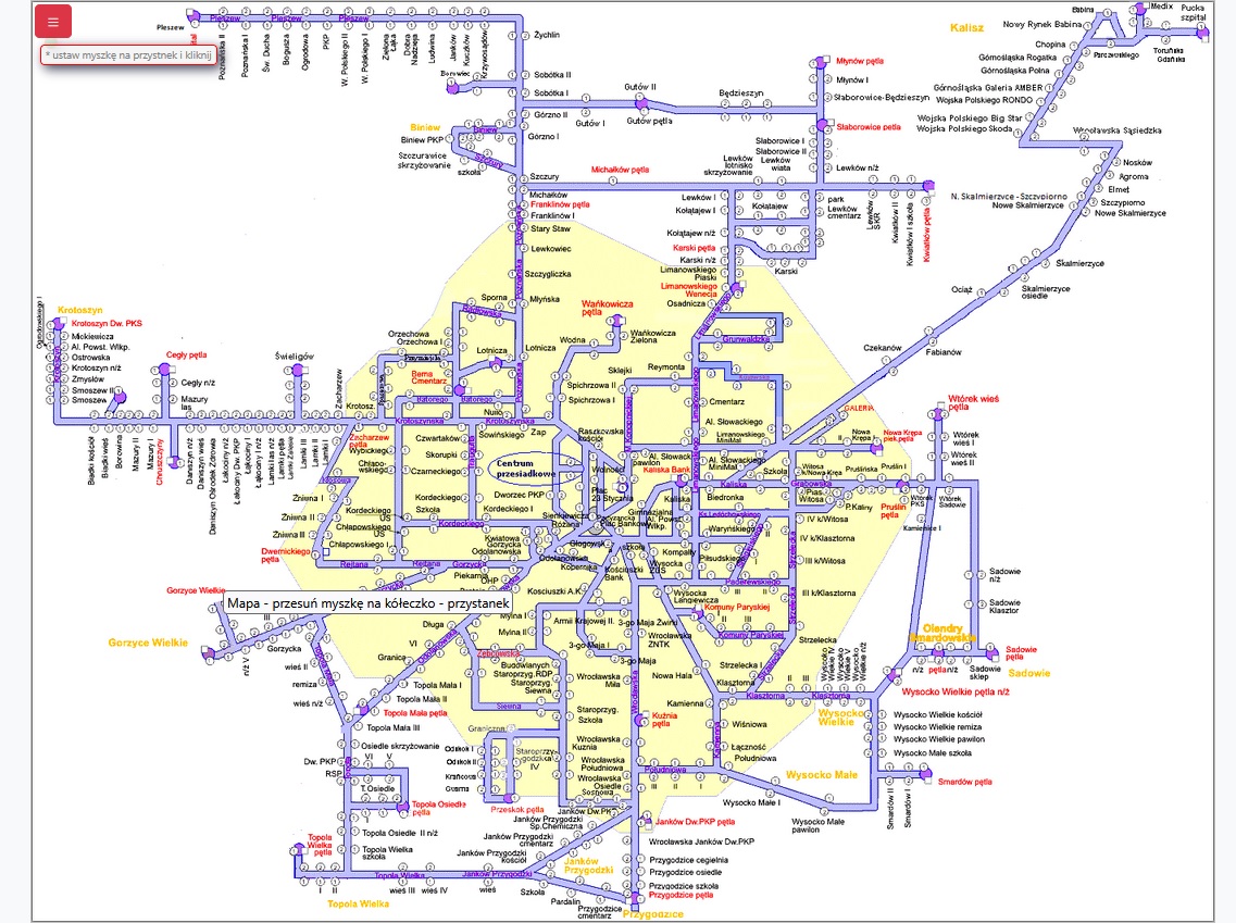 – aby odszukać dowolny przystanek na mapie należy w polu SZUKAJ PRZYSTANKU (po lewej stronie) wpisać nazwę lub cześć nazwy danego przystanku